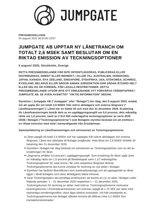Styrelsen i Jumpgate AB (”Jumpgate” eller ”Bolaget”) har idag, den 5 augusti 2025, avtalat om att uppta lån om totalt 2,6 MSEK från större aktieägare och externa långivare (”Lånefinansieringen”). Lånet har en löptid till och med den 31 december 2026. Ersättning för Lånefinansieringen består dels av en uppläggningsavgift om 5,0 procent, dels månatlig ränta om 1,0 procent, samt av 2 912 000 vederlagsfria teckningsoptioner av serie 2025/2026 i Bolaget (”Teckningsoptionerna”) som Bolagets styrelse beslutat om att emittera i en riktad emission med stöd i bemyndigande från årsstämman.