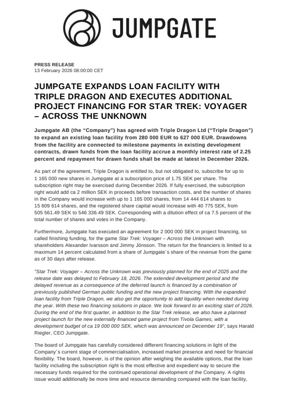 ”Star Trek: Voyager – Across the Unknown was previously planned for the end of 2025 and the release date was delayed to February 18, 2026. The extended development period and the delayed revenue as a consequence of the deferred launch is financed by a combination of previously published German public funding and the new project financing. With the expanded loan facility from Triple Dragon, we also get the opportunity to add liquidity when needed during the year. With these two financing solutions in place. We look forward to an exciting start of 2026. During the end of the first quarter, in addition to the Star Trek release, we also have a planned project launch for the new externally financed game project from Tivola Games, with a development budget of ca 19 000 000 SEK, which was announced on December 19”, says Harald Riegler, CEO Jumpgate.