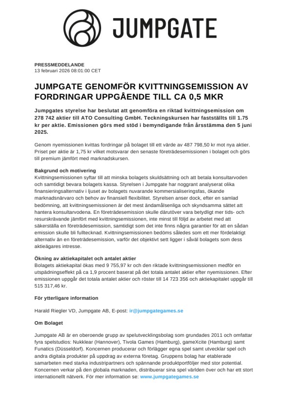 Jumpgates styrelse har beslutat att genomföra en riktad kvittningsemission om 278 742 aktier till ATO Consulting GmbH. Teckningskursen har fastställts till 1.75 kr per aktie. Emissionen görs med stöd i bemyndigande från årsstämma den 5 juni 2025.