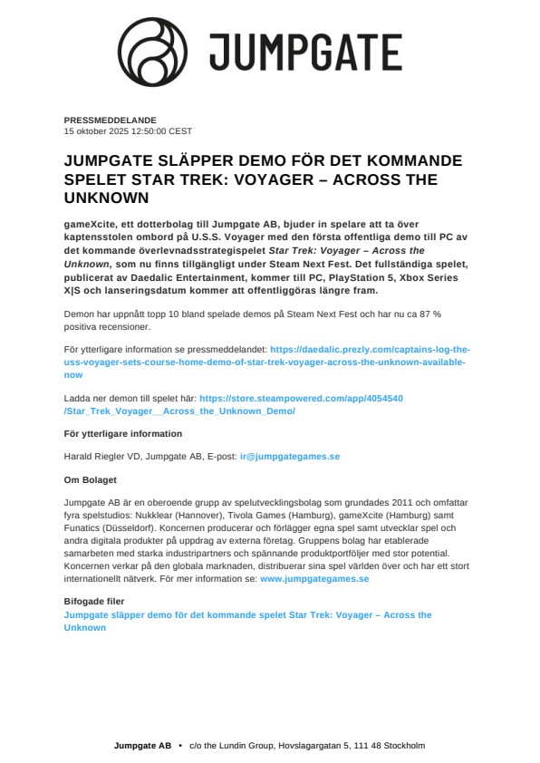 Harald Riegler VD, Jumpgate AB, E-post: ir@jumpgategames.se