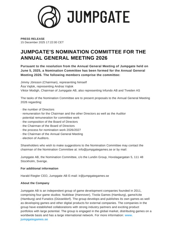 Pursuant to the resolution from the Annual General Meeting of Jumpgate held on June 5, 2025, a Nomination Committee has been formed for the Annual General Meeting 2026. The following members comprise the committee: