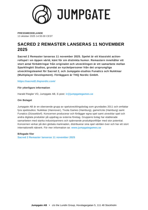 Harald Riegler VD, Jumpgate AB, E-post: ir@jumpgategames.se
