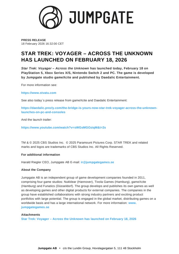 Harald Riegler CEO, Jumpgate AB E-mail: ir@jumpgategames.se
