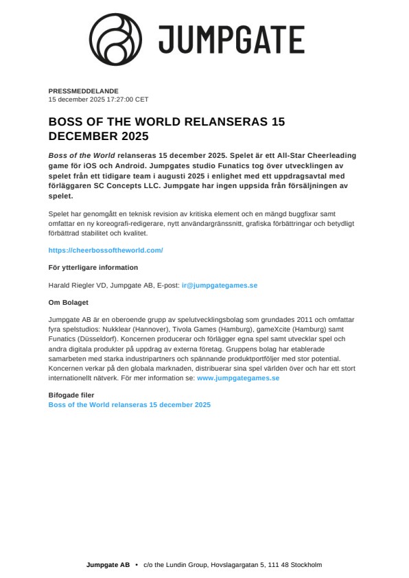 Boss of the World relanseras 15 december 2025. Spelet är ett All-Star Cheerleading game för iOS och Android. Jumpgates studio Funatics tog över utvecklingen av spelet från ett tidigare team i augusti 2025 i enlighet med ett uppdragsavtal med förläggaren SC Concepts LLC. Jumpgate har ingen uppsida från försäljningen av spelet.