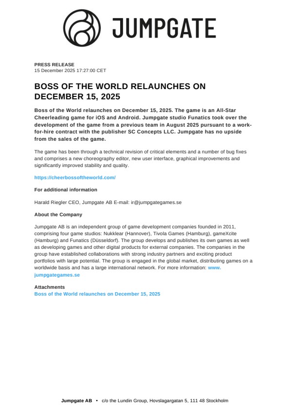 Boss of the World relaunches on December 15, 2025. The game is an All-Star Cheerleading game for iOS and Android. Jumpgate studio Funatics took over the development of the game from a previous team in August 2025 pursuant to a work-for-hire contract with the publisher SC Concepts LLC. Jumpgate has no upside from the sales of the game.