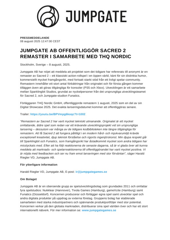 “Remastern av Sacred 2 har varit mycket tekniskt utmanande. Originalet är ett mycket omfattande, äldre spel som redan var ett krävande utvecklingsprojekt vid sin ursprungliga lansering – dessutom var många av de tidigare kodbiblioteken inte längre tillgängliga för remastern. Att få Sacred 2 att fungera pålitligt i en modern hård- och mjukvarumiljö krävde exceptionell kreativitet, djup teknisk förståelse och rigorös ingenjörskonst. Min djupa respekt går till Sparklingbit och Funatics, som framgångsrikt har åstadkommit mycket som andra tidigare har misslyckats med. Efter att ha följt reaktionerna de senaste dagarna, så är vi glada över att kunna meddela att marknads- och spelarreaktionerna till offentliggörandet har varit mycket positiva. Vi är nöjda med feedbacken och ser nu fram emot lanseringen med stor förväntan”, säger Harald Riegler VD, Jumpgate AB.