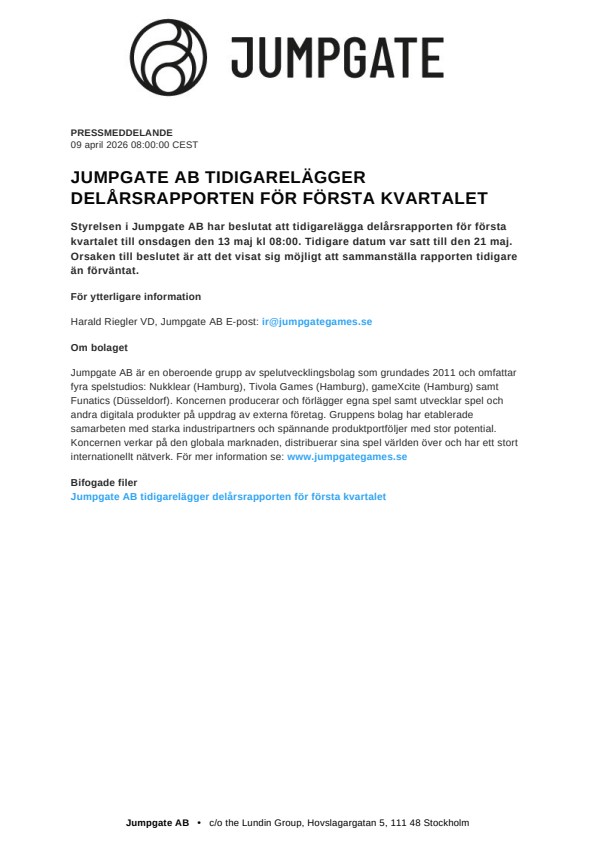 Styrelsen i Jumpgate AB har beslutat att tidigarelägga delårsrapporten för första kvartalet till onsdagen den 13 maj kl 08:00. Tidigare datum var satt till den 21 maj. Orsaken till beslutet är att det visat sig möjligt att sammanställa rapporten tidigare än förväntat.