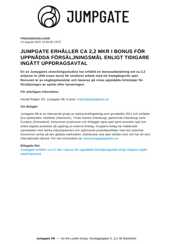 Harald Riegler VD, Jumpgate AB, E-post: ir@jumpgategames.se