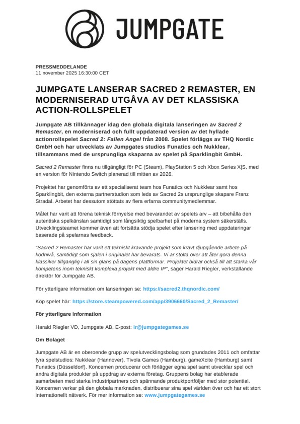 “Sacred 2 Remaster har varit ett tekniskt krävande projekt som krävt djupgående arbete på kodnivå, samtidigt som själen i originalet har bevarats. Vi är stolta över att åter göra denna klassiker tillgänglig i all sin glans på dagens plattformar. Projektet bidrar också till att stärka vår kompetens inom tekniskt komplexa projekt med äldre IP”, säger Harald Riegler, verkställande direktör för Jumpgate AB.