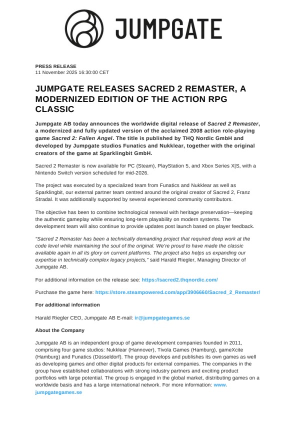 Harald Riegler CEO, Jumpgate AB E-mail: ir@jumpgategames.se
