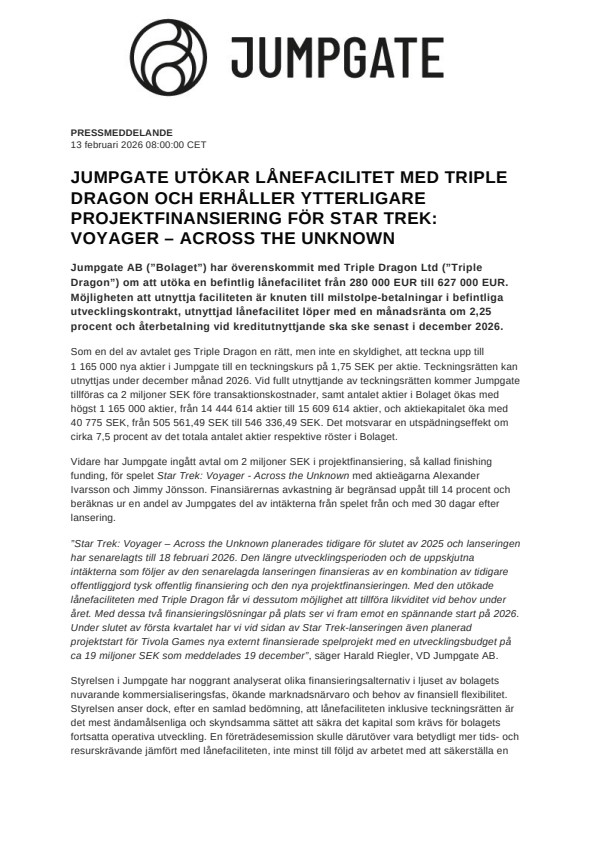 ”Star Trek: Voyager – Across the Unknown planerades tidigare för slutet av 2025 och lanseringen har senarelagts till 18 februari 2026. Den längre utvecklingsperioden och de uppskjutna intäkterna som följer av den senarelagda lanseringen finansieras av en kombination av tidigare offentliggjord tysk offentlig finansiering och den nya projektfinansieringen. Med den utökade lånefaciliteten med Triple Dragon får vi dessutom möjlighet att tillföra likviditet vid behov under året. Med dessa två finansieringslösningar på plats ser vi fram emot en spännande start på 2026. Under slutet av första kvartalet har vi vid sidan av Star Trek-lanseringen även planerad projektstart för Tivola Games nya externt finansierade spelprojekt med en utvecklingsbudget på ca 19 miljoner SEK som meddelades 19 december”, säger Harald Riegler, VD Jumpgate AB.