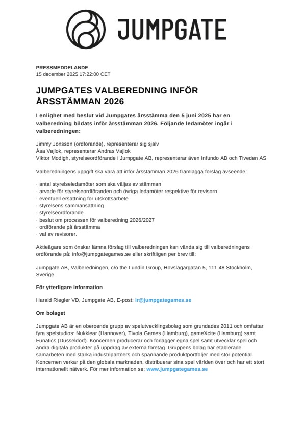 Aktieägare som önskar lämna förslag till valberedningen kan vända sig till valberedningens ordförande på: info@jumpgategames.se eller skriftligen per brev till: