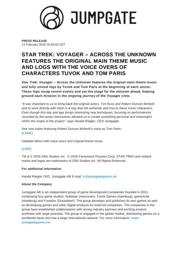 Harald Riegler CEO, Jumpgate AB E-mail: ir@jumpgategames.se