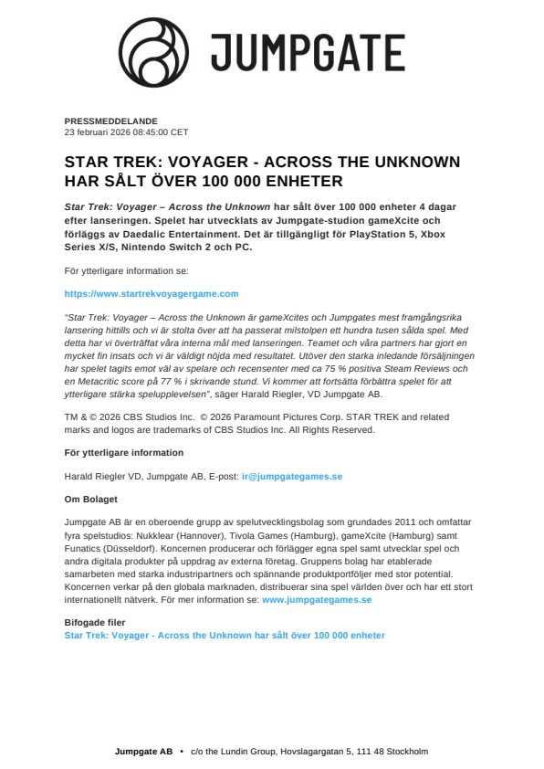 “Star Trek: Voyager – Across the Unknown är gameXcites och Jumpgates mest framgångsrika lansering hittills och vi är stolta över att ha passerat milstolpen ett hundra tusen sålda spel. Med detta har vi överträffat våra interna mål med lanseringen. Teamet och våra partners har gjort en mycket fin insats och vi är väldigt nöjda med resultatet. Utöver den starka inledande försäljningen har spelet tagits emot väl av spelare och recensenter med ca 75 % positiva Steam Reviews och en Metacritic score på 77 % i skrivande stund. Vi kommer att fortsätta förbättra spelet för att ytterligare stärka spelupplevelsen”, säger Harald Riegler, VD Jumpgate AB.