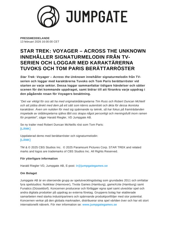 Harald Riegler VD, Jumpgate AB, E-post: ir@jumpgategames.se