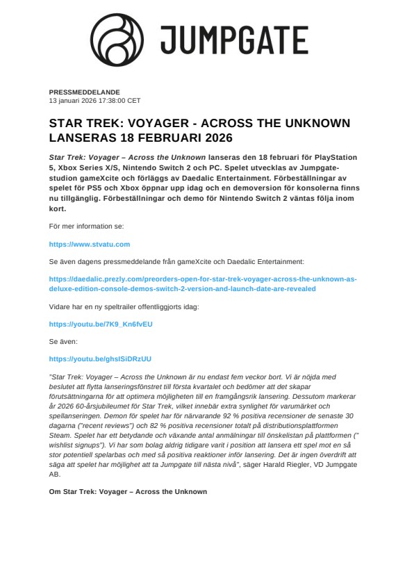 ”Star Trek: Voyager – Across the Unknown är nu endast fem veckor bort. Vi är nöjda med beslutet att flytta lanseringsfönstret till första kvartalet och bedömer att det skapar förutsättningarna för att optimera möjligheten till en framgångsrik lansering. Dessutom markerar år 2026 60-årsjubileumet för Star Trek, vilket innebär extra synlighet för varumärket och spellanseringen. Demon för spelet har för närvarande 92 % positiva recensioner de senaste 30 dagarna (”recent reviews”) och 82 % positiva recensioner totalt på distributionsplattformen Steam. Spelet har ett betydande och växande antal anmälningar till önskelistan på plattformen (”wishlist signups”). Vi har som bolag aldrig tidigare varit i position att lansera ett spel mot en så stor potentiell spelarbas och med så positiva reaktioner inför lansering. Det är ingen överdrift att säga att spelet har möjlighet att ta Jumpgate till nästa nivå”, säger Harald Riegler, VD Jumpgate AB.